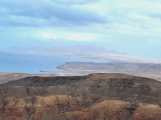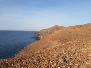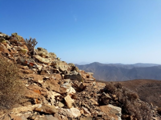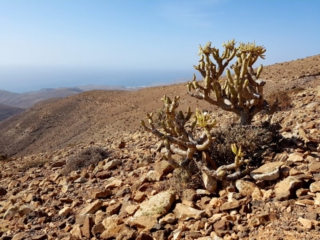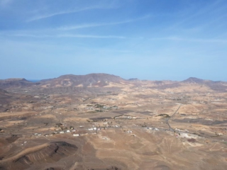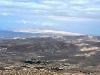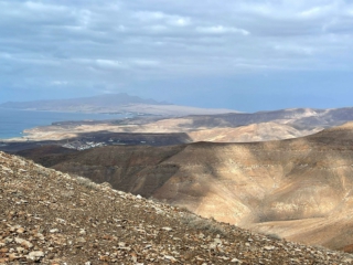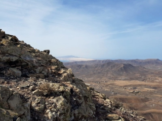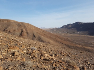 Während es langsam und stetig über loses Gestein aufwärts geht lohnt ein Blick zur Seite. Ab einer gewissen Höhe taucht unten im Tal Tarajalejo auf und weiter am Horizont kann man bis zur Costa Calma blicken. An klaren Tagen ist die komplette südliche Halbinsel zu sehen.
