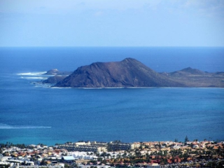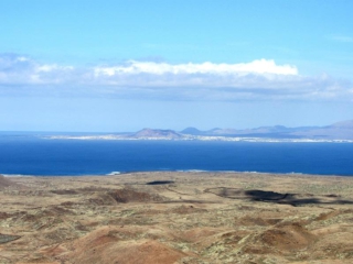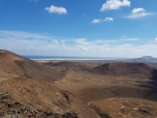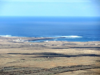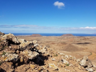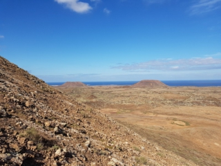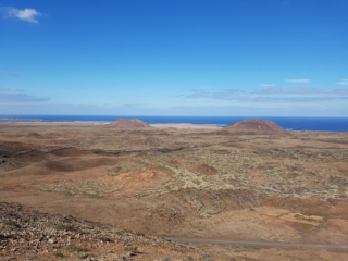 Von der Aussichtsplattform bietet sich eine tolle Aussicht zurück bis hin zum Bayuyo. Bei klarer Sicht können wir an der Küste Majanicho und den Leuchtturm von Cotillo erkennen.