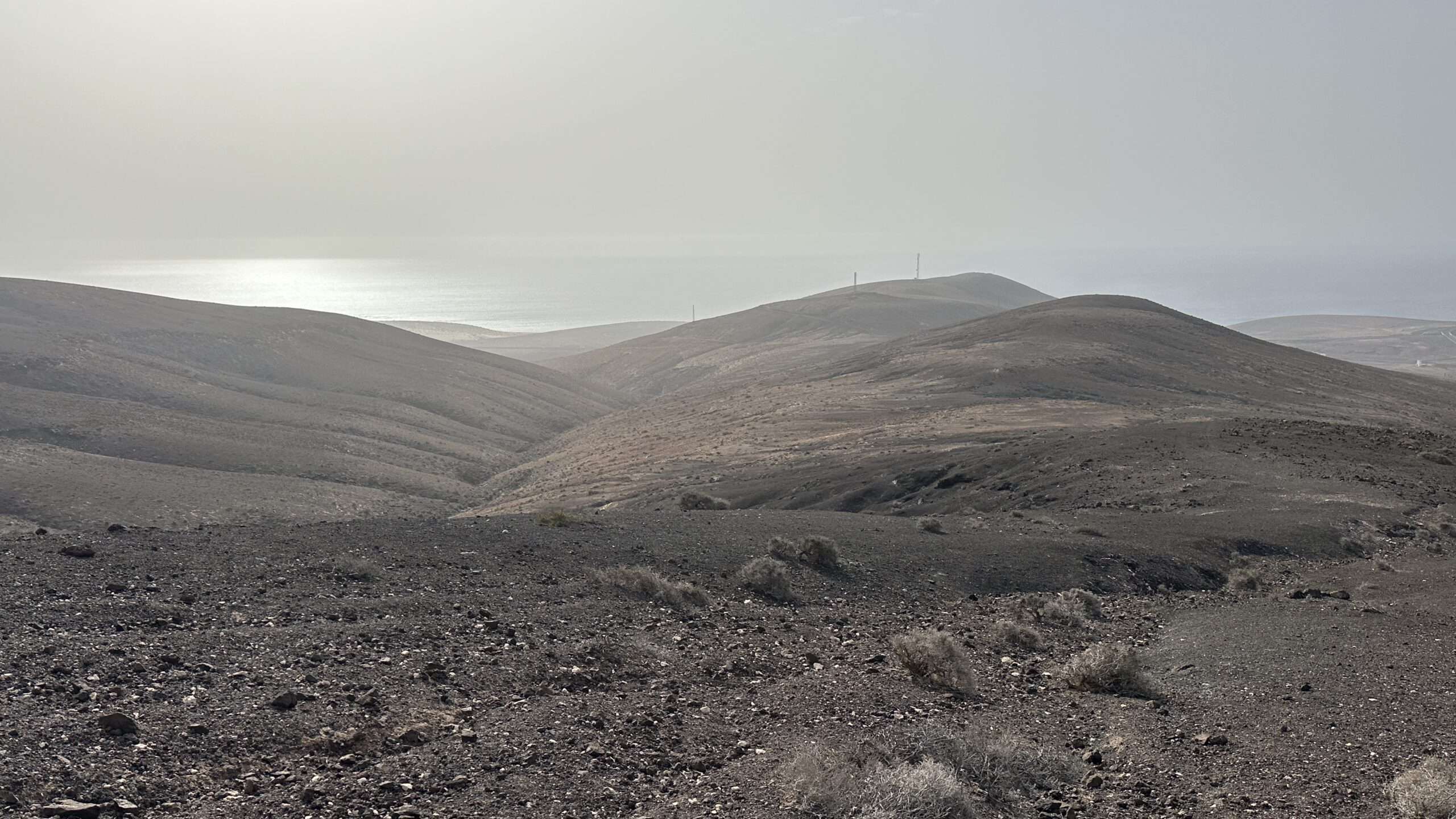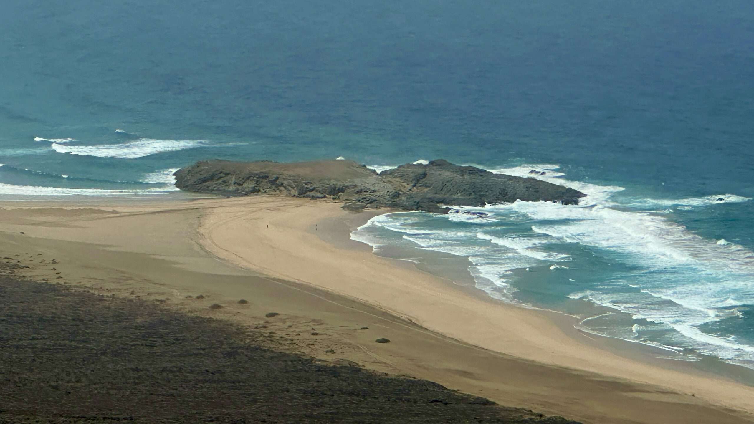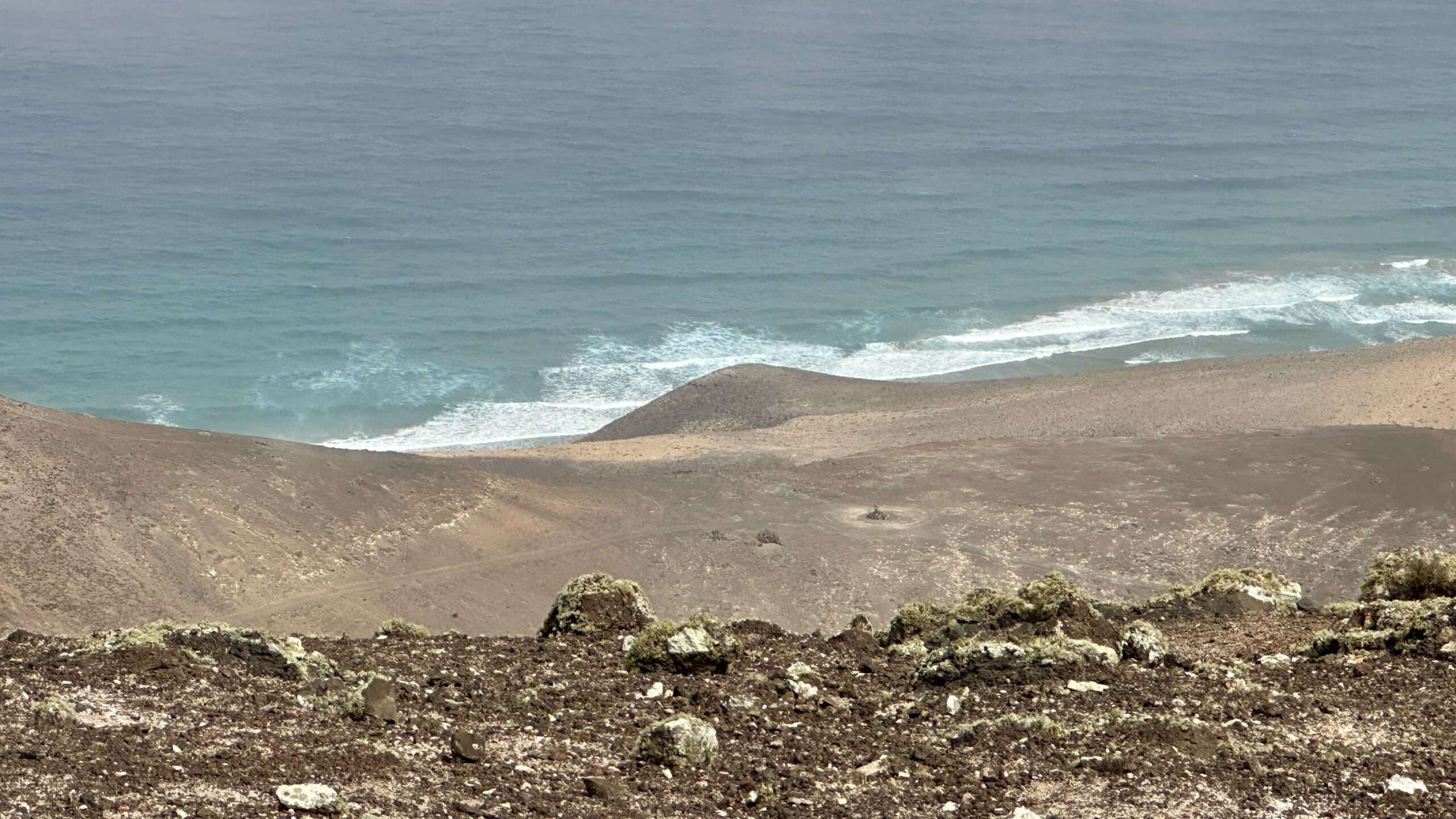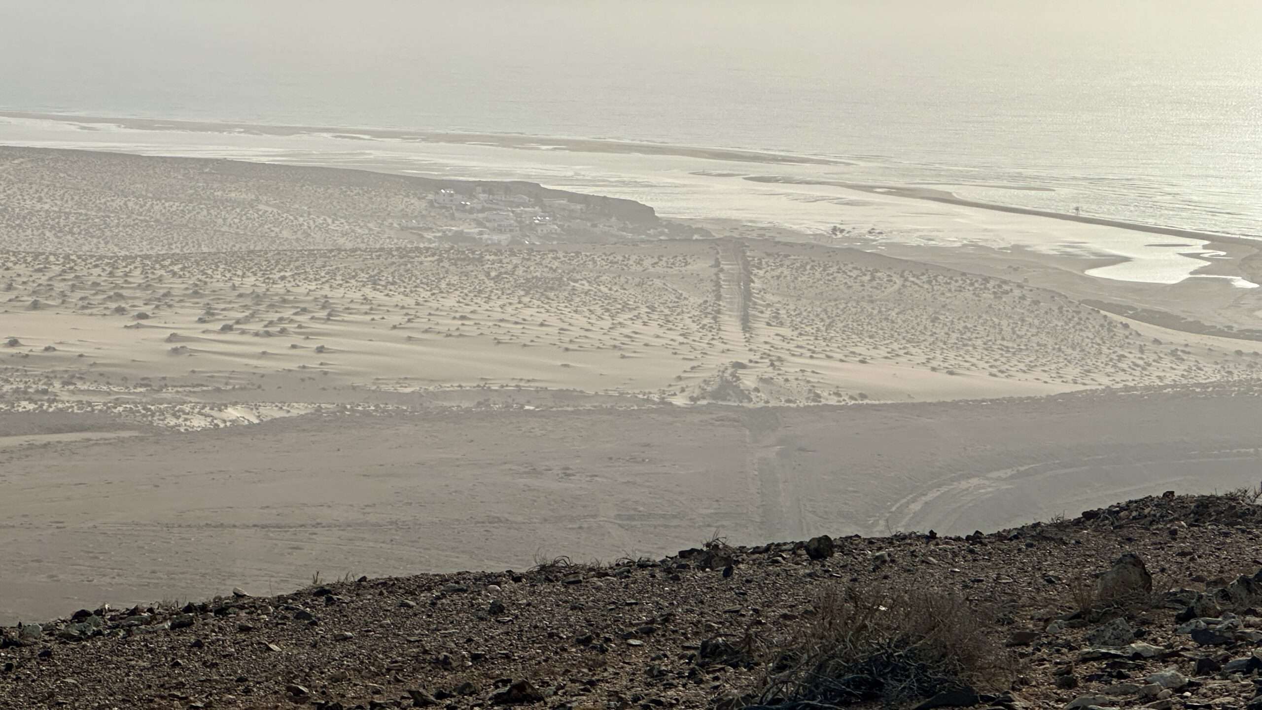 Wir wanderten weiter, die Luft klar, der Wind freundlich, und erreichten die Degollada del Salmo, dann den Frontón del Salmo. Mehr als einmal hielten wir inne, um den Blick schweifen zu lassen: Im Norden erhob sich die Lomo Negra, dunkel und geheimnisvoll, während die Urbanización Pescenescal wie ein weißes Schachbrett in der Landschaft lag. Die Lagune der Playa Barca glitzerte wie flüssiges Silber, und die FV-2 schlängelte sich wie ein träger Wurm durch das endlose El Jable. Drehten wir uns um, sahen wir im Süden die kleine Siedlung und die Tankstelle, die nun winzig wie ein Spielzeug wirkten.