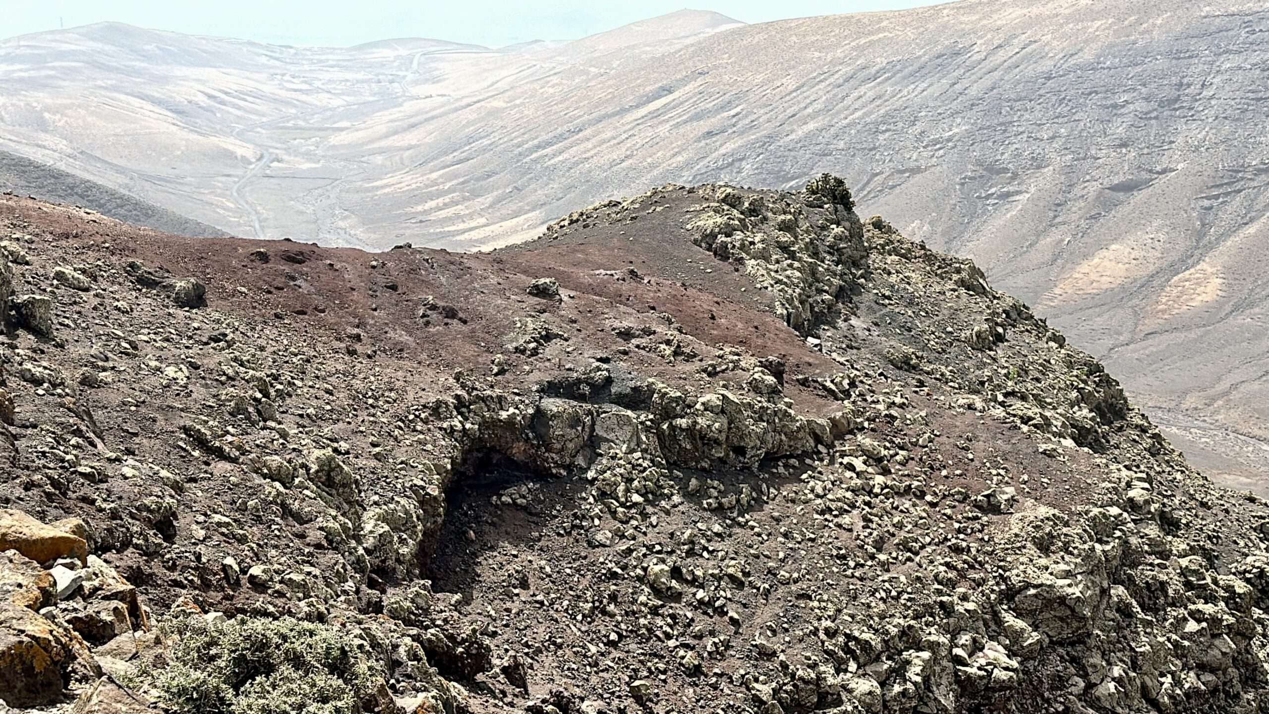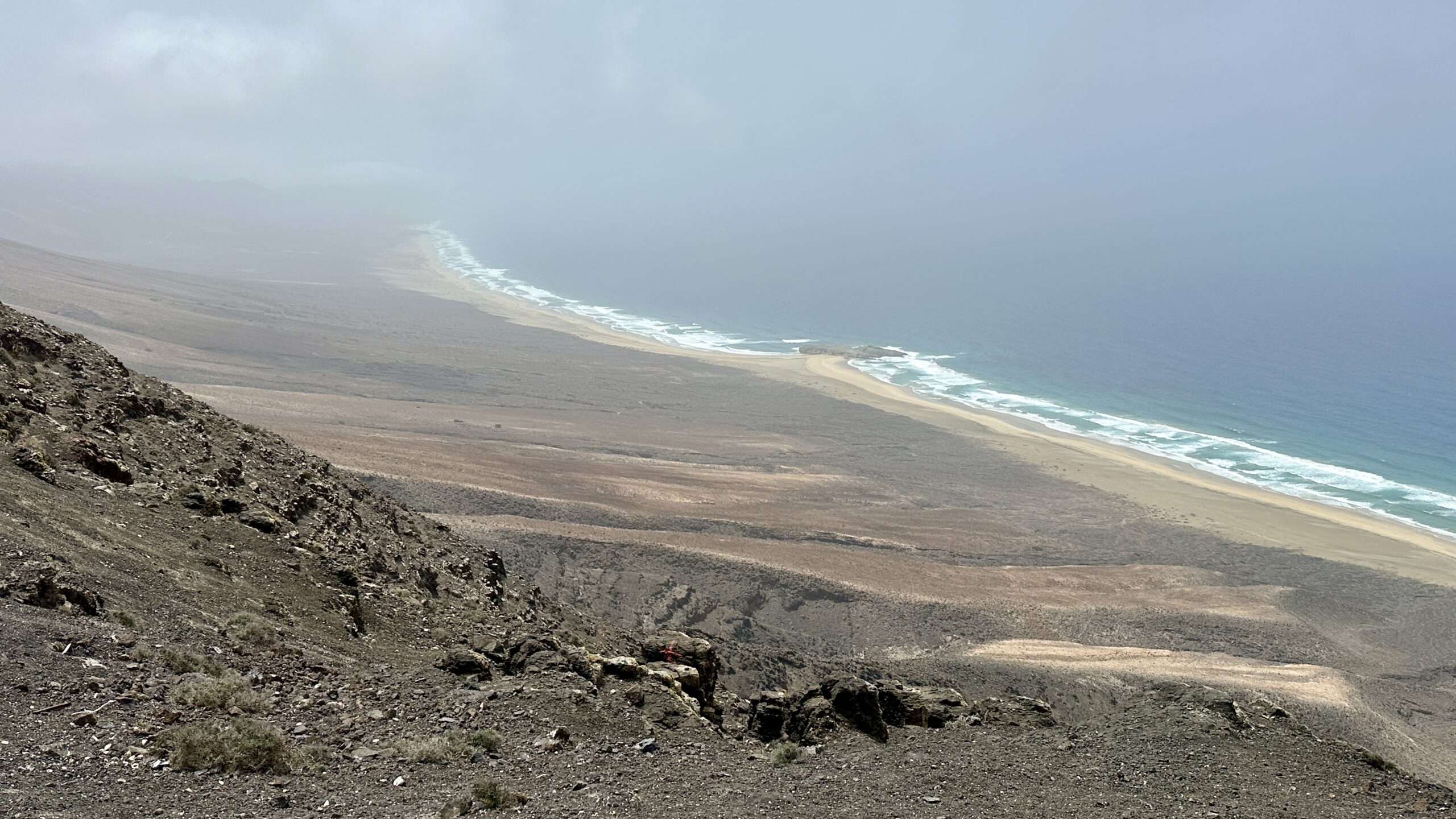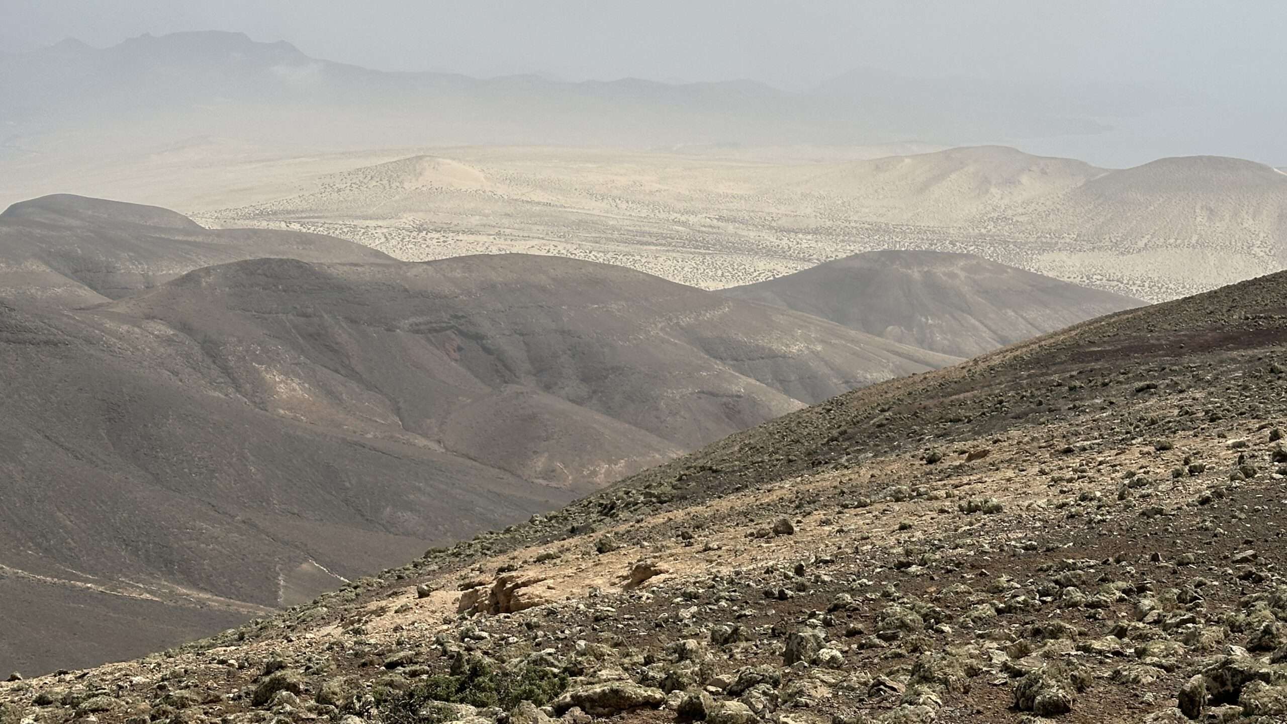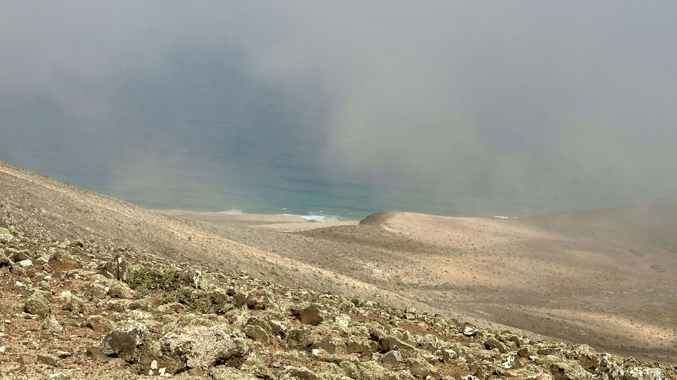 Wir wanderten weiter, die Luft klar, der Wind freundlich, und erreichten die Degollada del Salmo, dann den Frontón del Salmo. Mehr als einmal hielten wir inne, um den Blick schweifen zu lassen: Im Norden erhob sich die Lomo Negra, dunkel und geheimnisvoll, während die Urbanización Pescenescal wie ein weißes Schachbrett in der Landschaft lag. Die Lagune der Playa Barca glitzerte wie flüssiges Silber, und die FV-2 schlängelte sich wie ein träger Wurm durch das endlose El Jable. Drehten wir uns um, sahen wir im Süden die kleine Siedlung und die Tankstelle, die nun winzig wie ein Spielzeug wirkten.