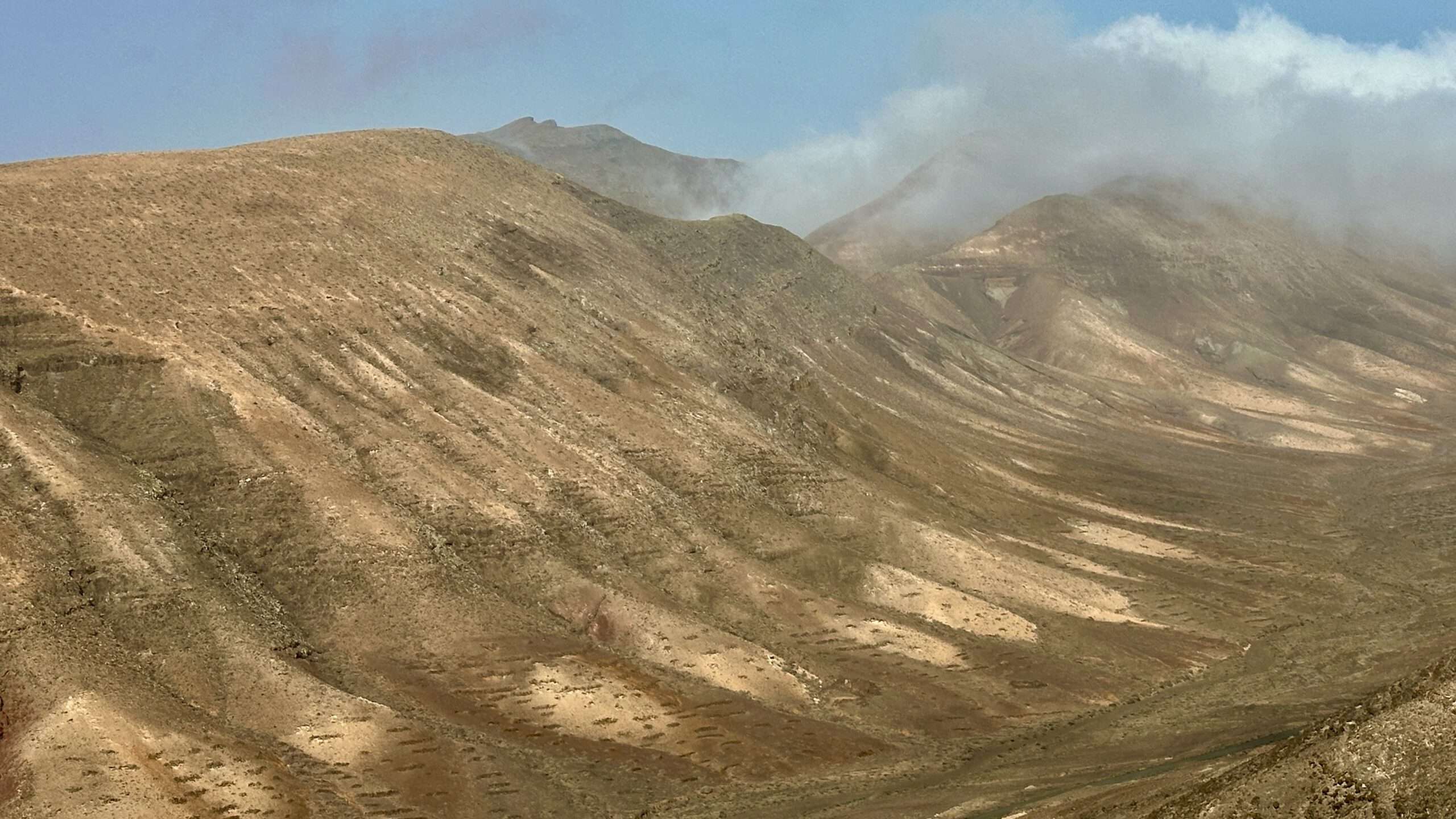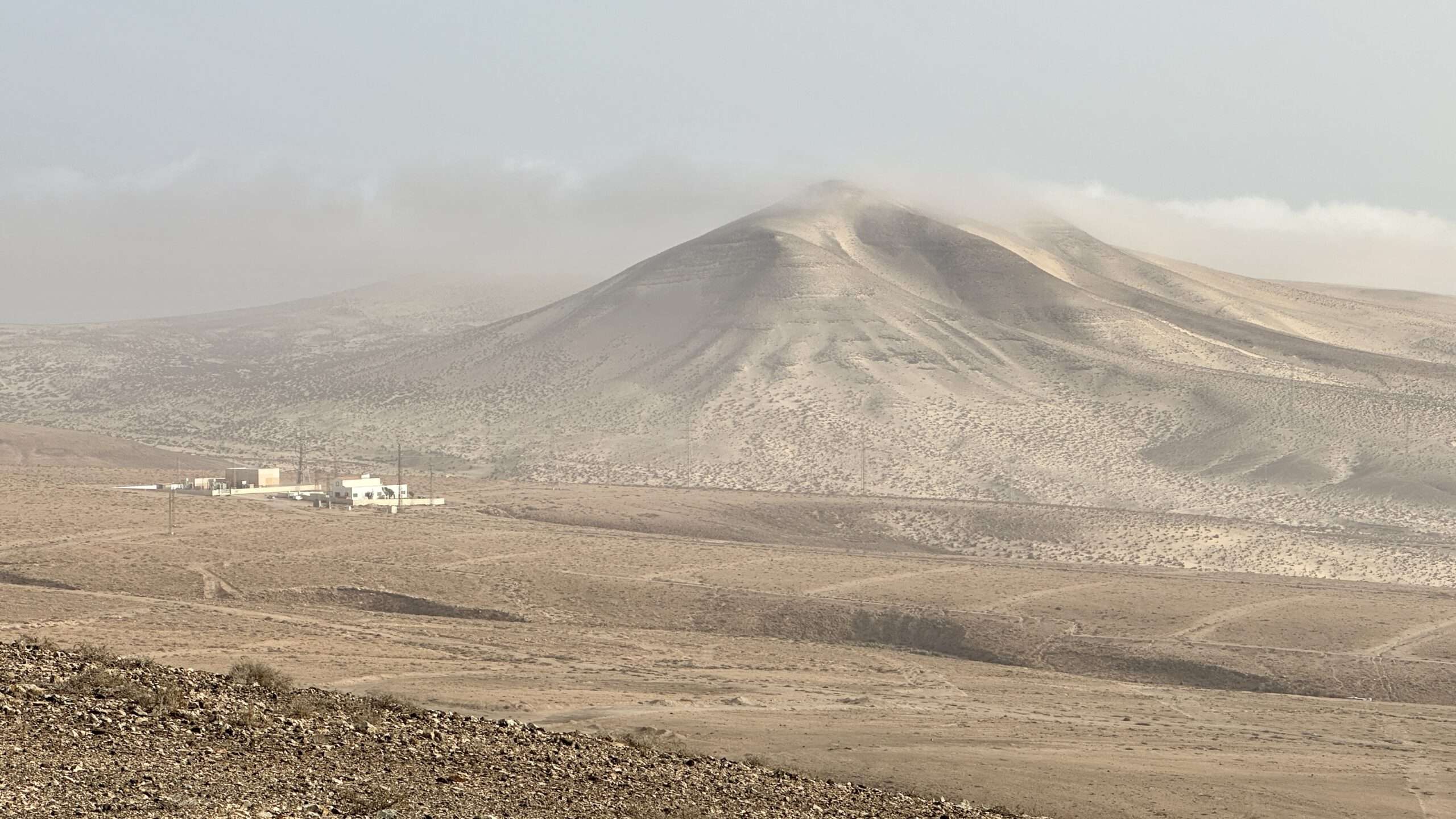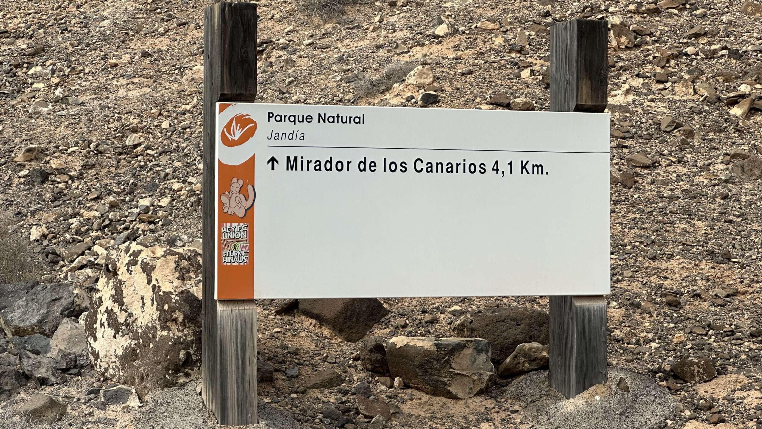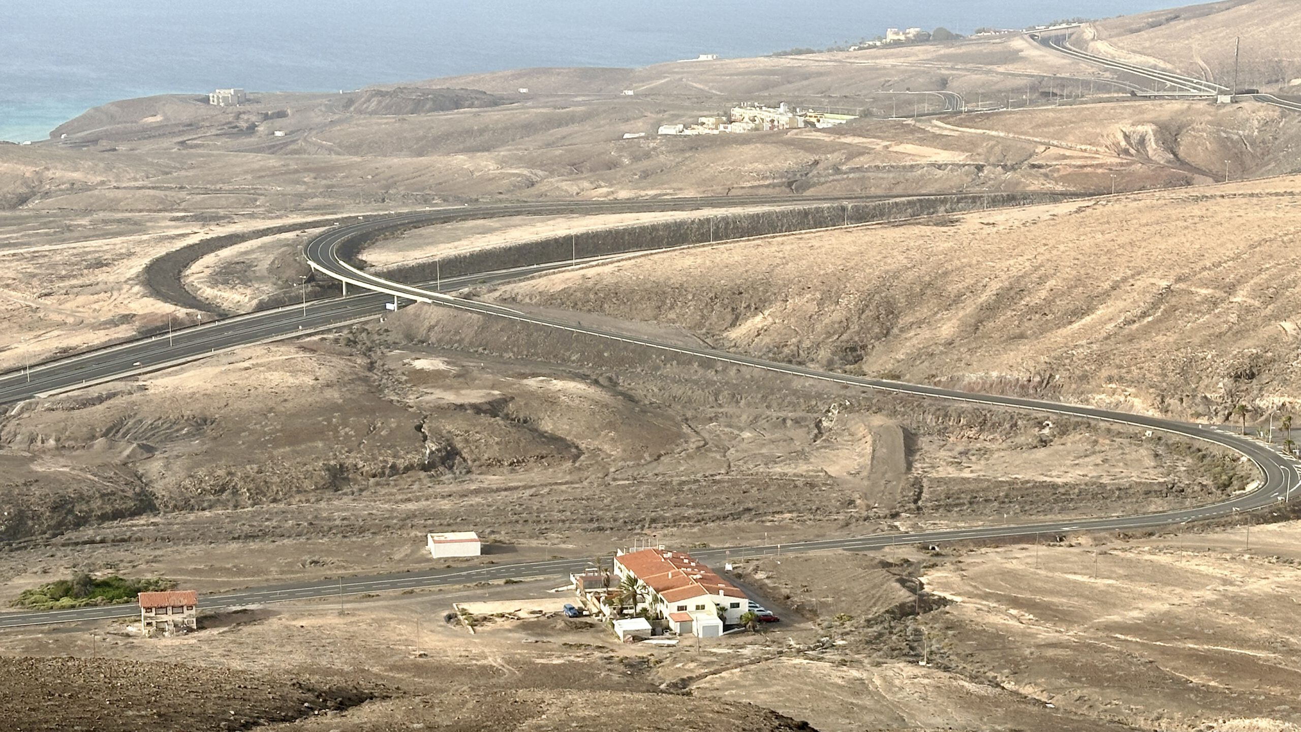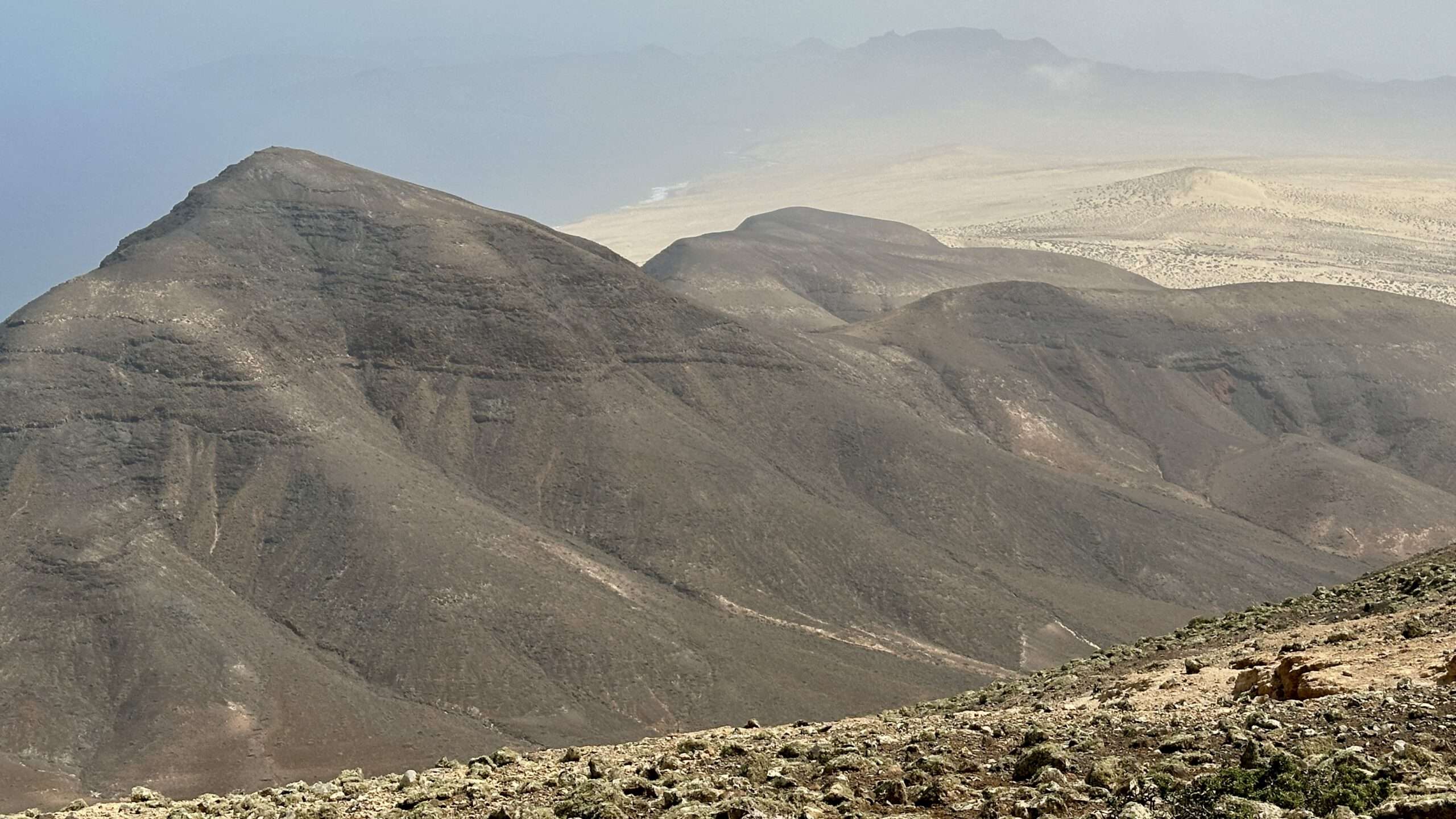 Wir wanderten weiter, die Luft klar, der Wind freundlich, und erreichten die Degollada del Salmo, dann den Frontón del Salmo. Mehr als einmal hielten wir inne, um den Blick schweifen zu lassen: Im Norden erhob sich die Lomo Negra, dunkel und geheimnisvoll, während die Urbanización Pescenescal wie ein weißes Schachbrett in der Landschaft lag. Die Lagune der Playa Barca glitzerte wie flüssiges Silber, und die FV-2 schlängelte sich wie ein träger Wurm durch das endlose El Jable. Drehten wir uns um, sahen wir im Süden die kleine Siedlung und die Tankstelle, die nun winzig wie ein Spielzeug wirkten.