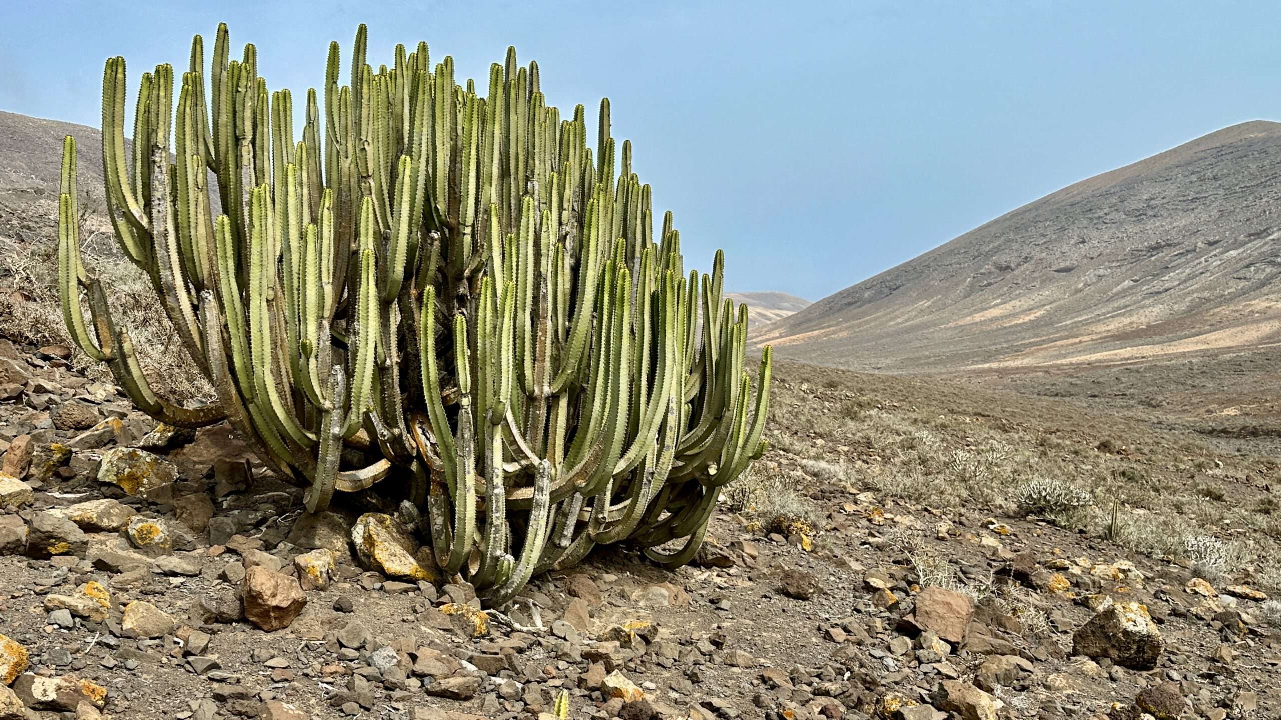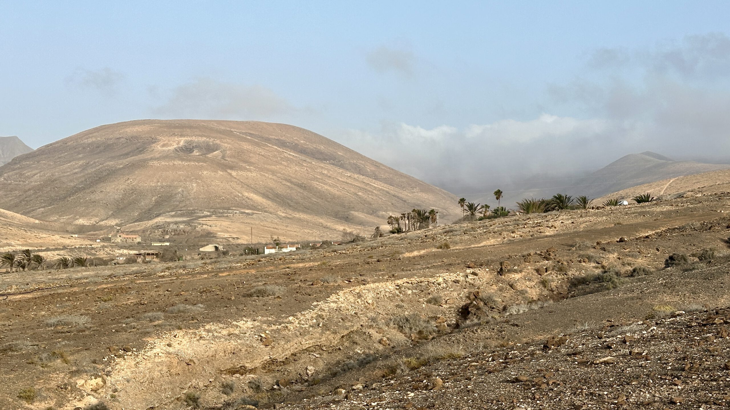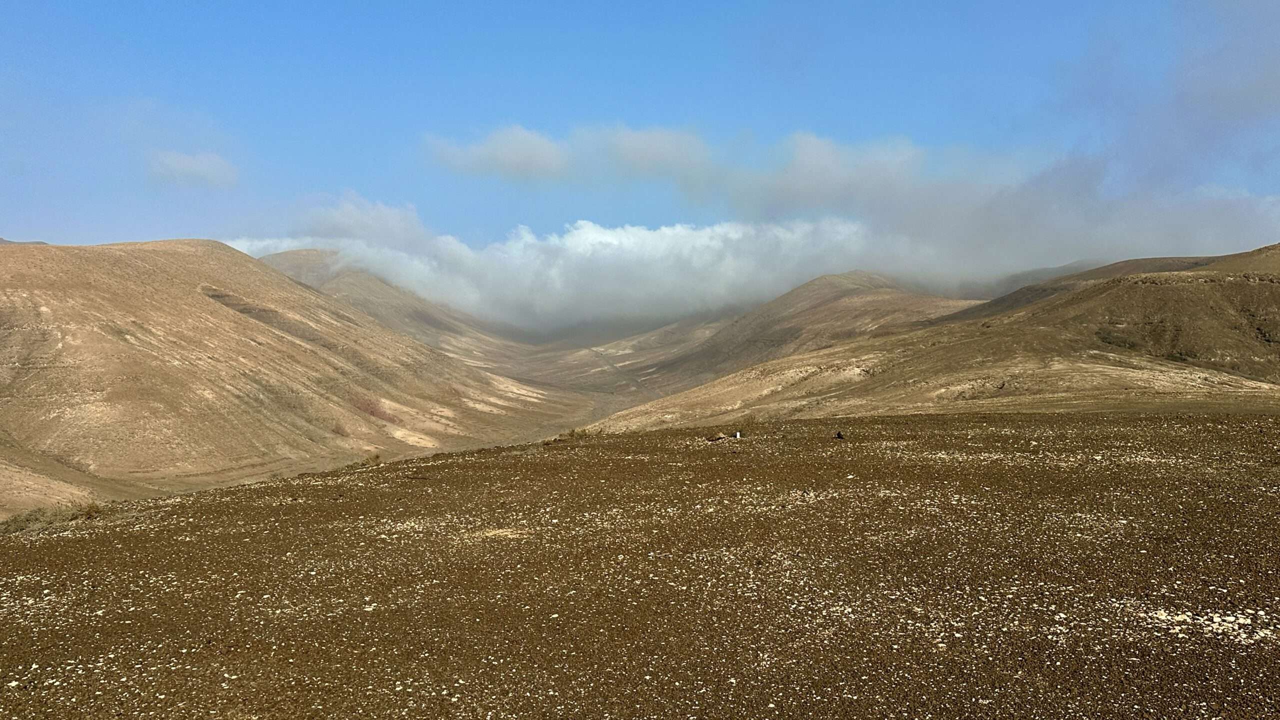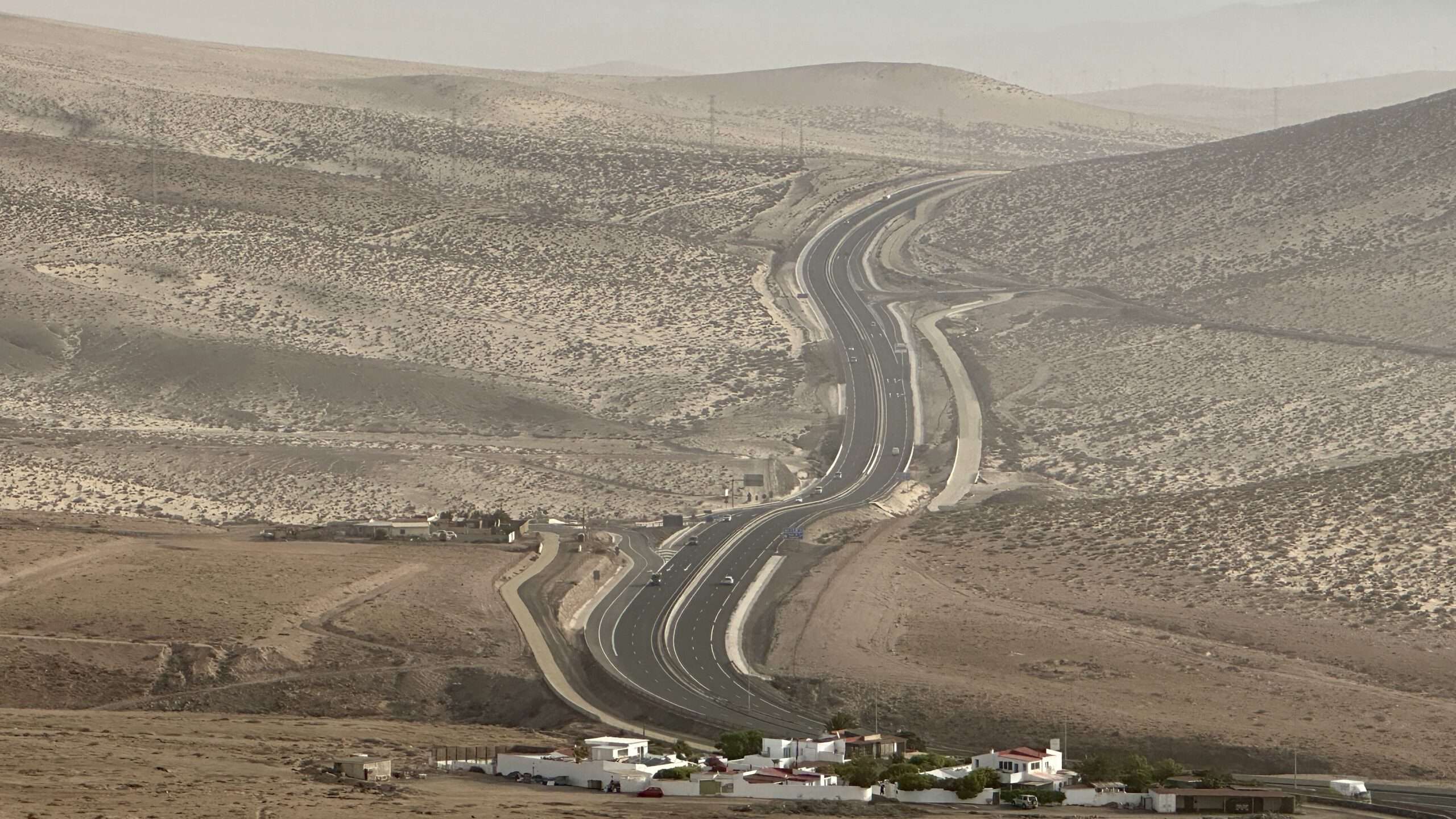 Wir wanderten weiter, die Luft klar, der Wind freundlich, und erreichten die Degollada del Salmo, dann den Frontón del Salmo. Mehr als einmal hielten wir inne, um den Blick schweifen zu lassen: Im Norden erhob sich die Lomo Negra, dunkel und geheimnisvoll, während die Urbanización Pescenescal wie ein weißes Schachbrett in der Landschaft lag. Die Lagune der Playa Barca glitzerte wie flüssiges Silber, und die FV-2 schlängelte sich wie ein träger Wurm durch das endlose El Jable. Drehten wir uns um, sahen wir im Süden die kleine Siedlung und die Tankstelle, die nun winzig wie ein Spielzeug wirkten.