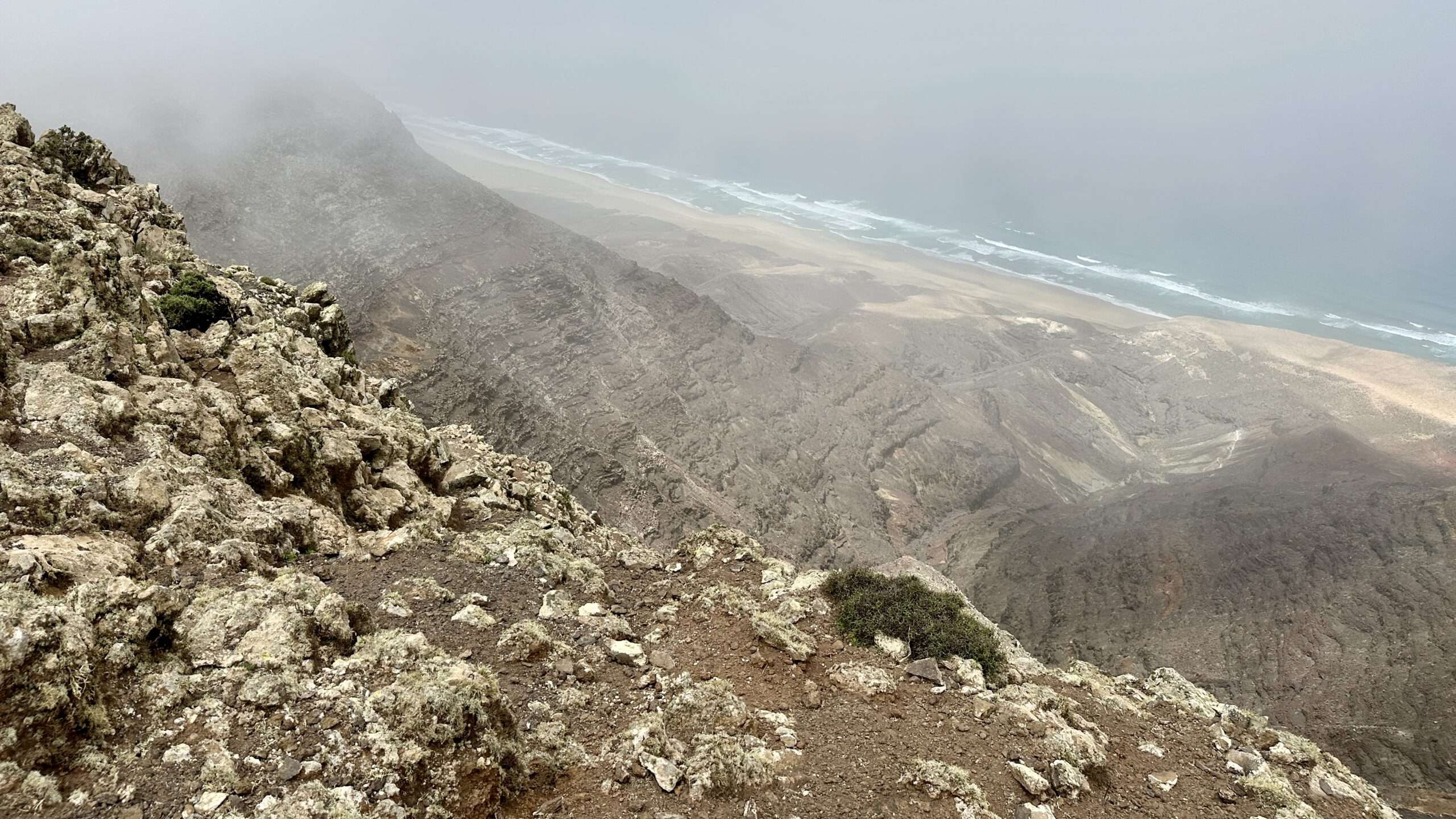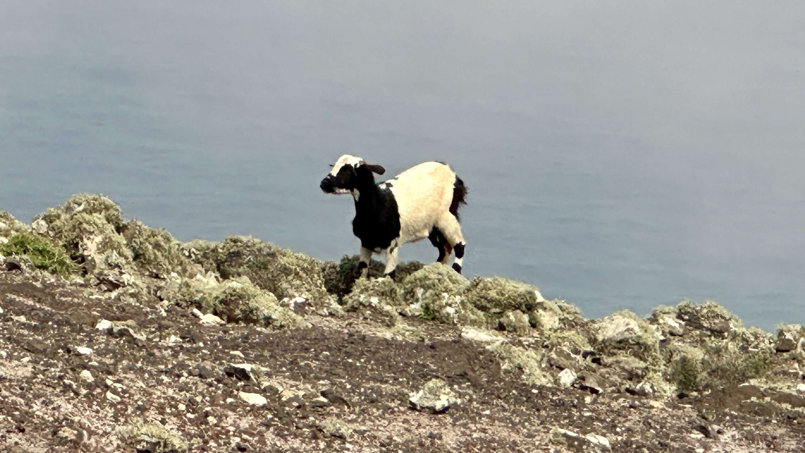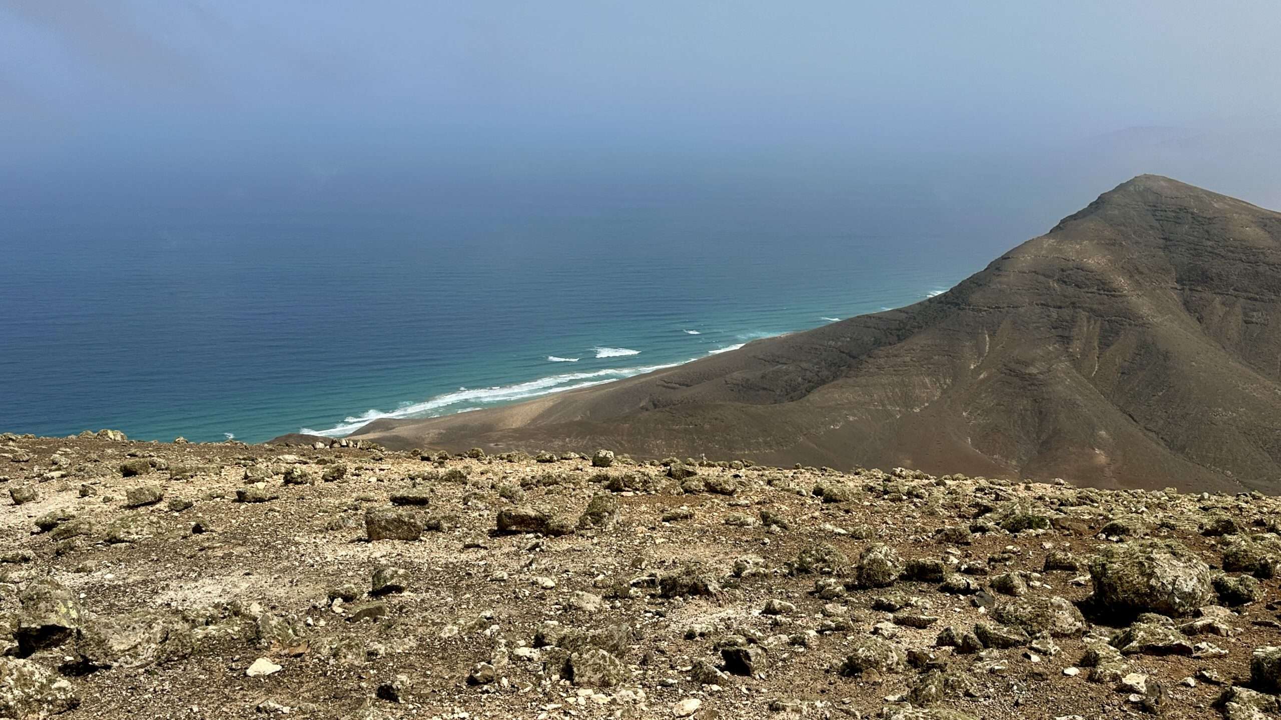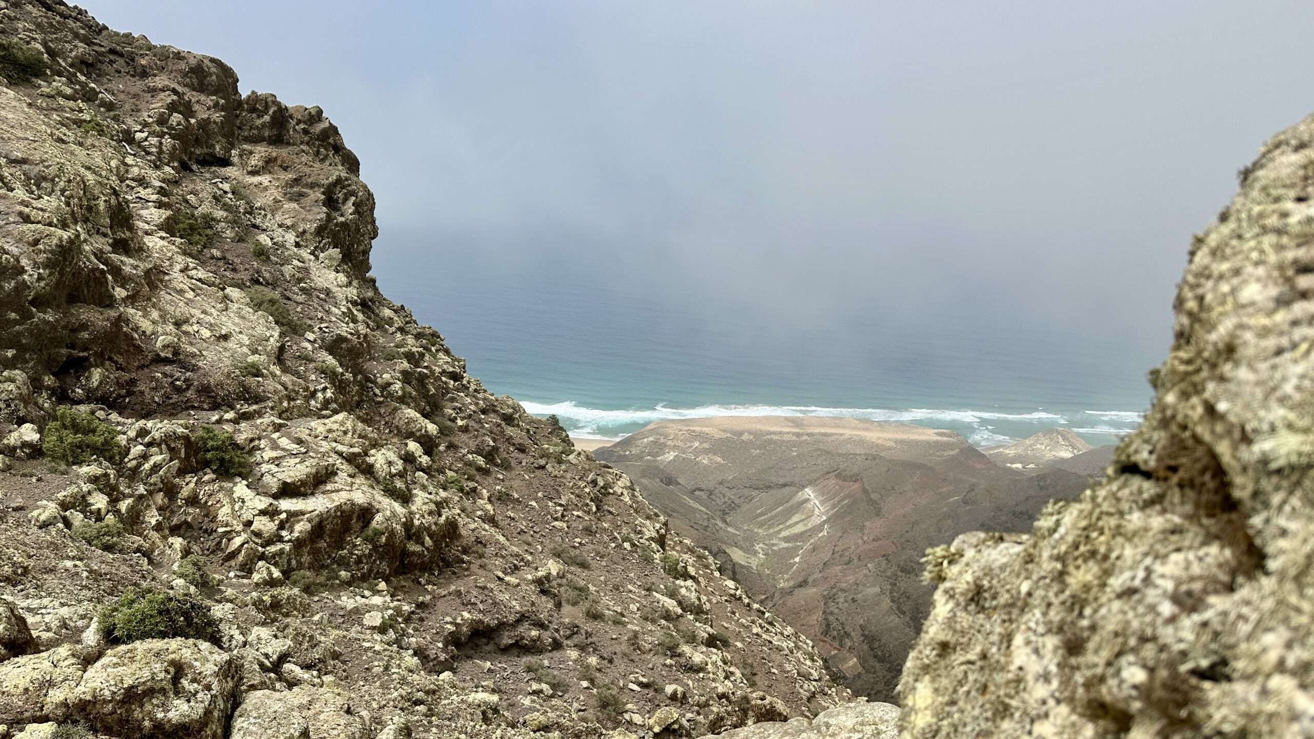 Mit höchster Konzentration, Händen an Fels und Herz im Rhythmus des Atems, stiegen wir hinab und wieder ein Stück hinauf zum Pico del Viento. Von hier führte eine alte Piste zu einer Plattform, wo die verfallene Straße endet und sich der Blick weit öffnet: zur wilden Westküste, zum winzigen El Islote, das wie ein Smaragd im Wasser liegt.