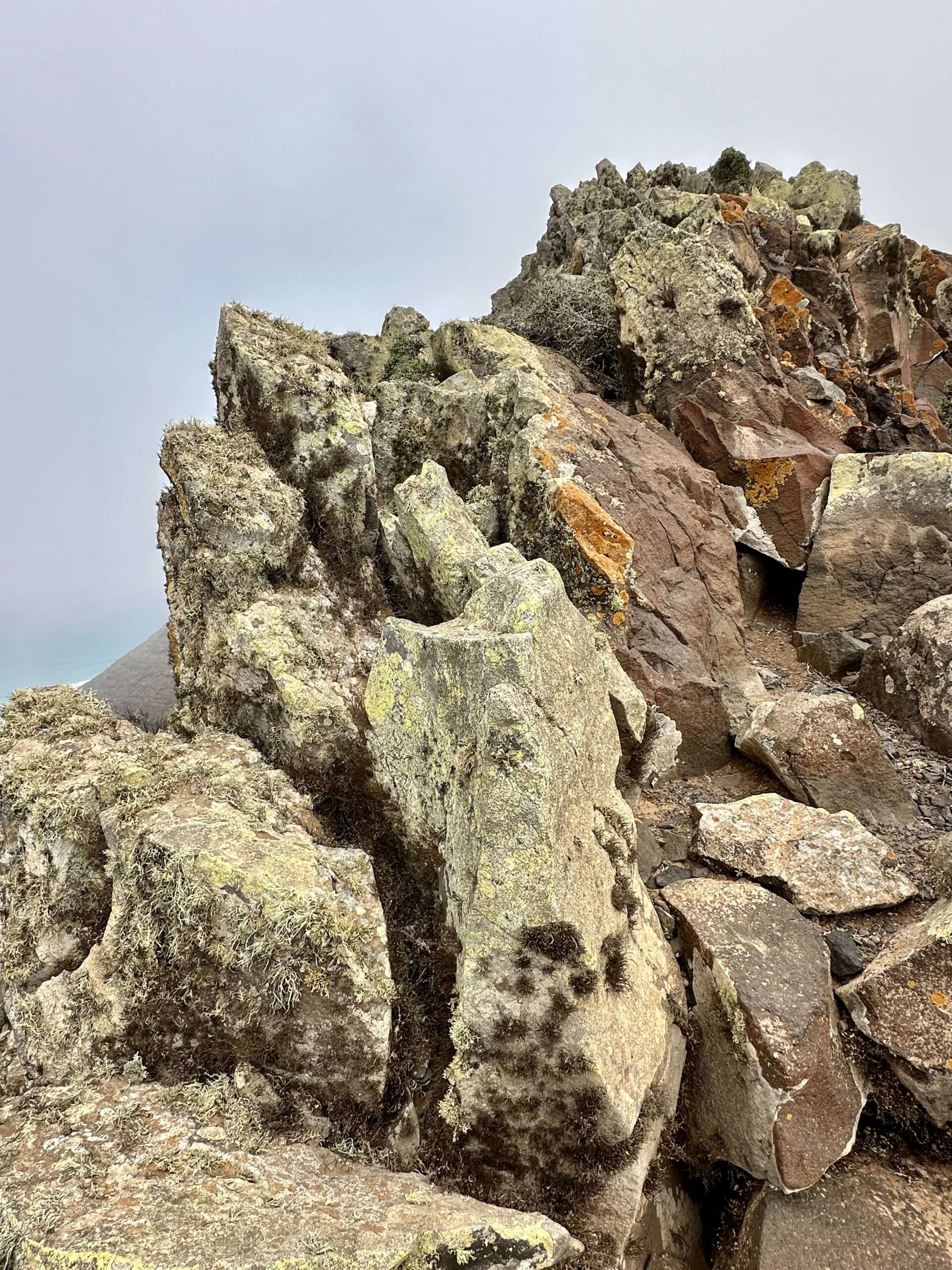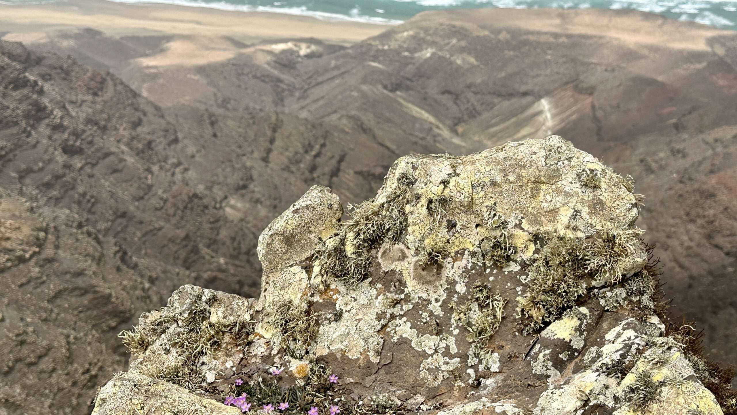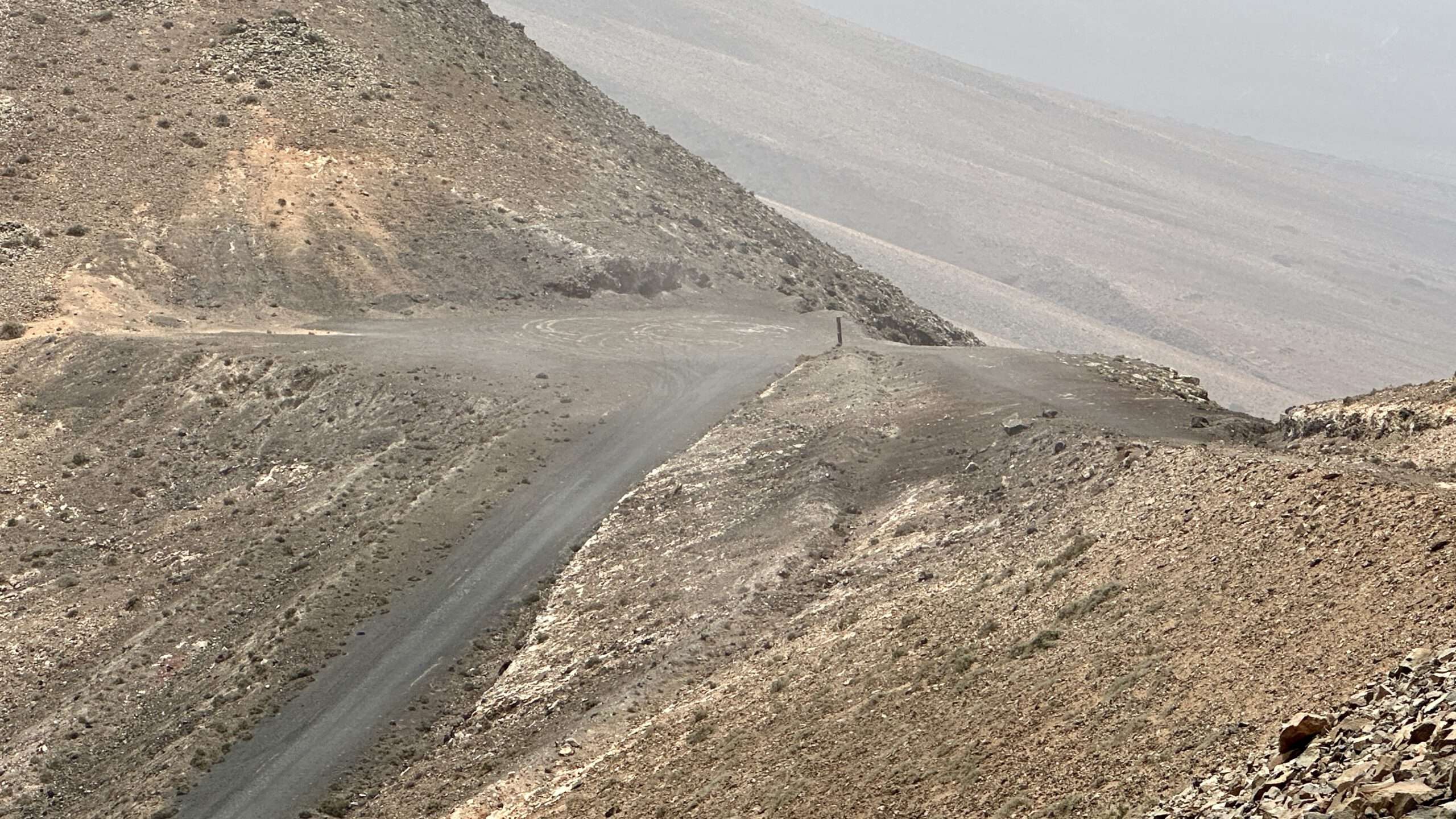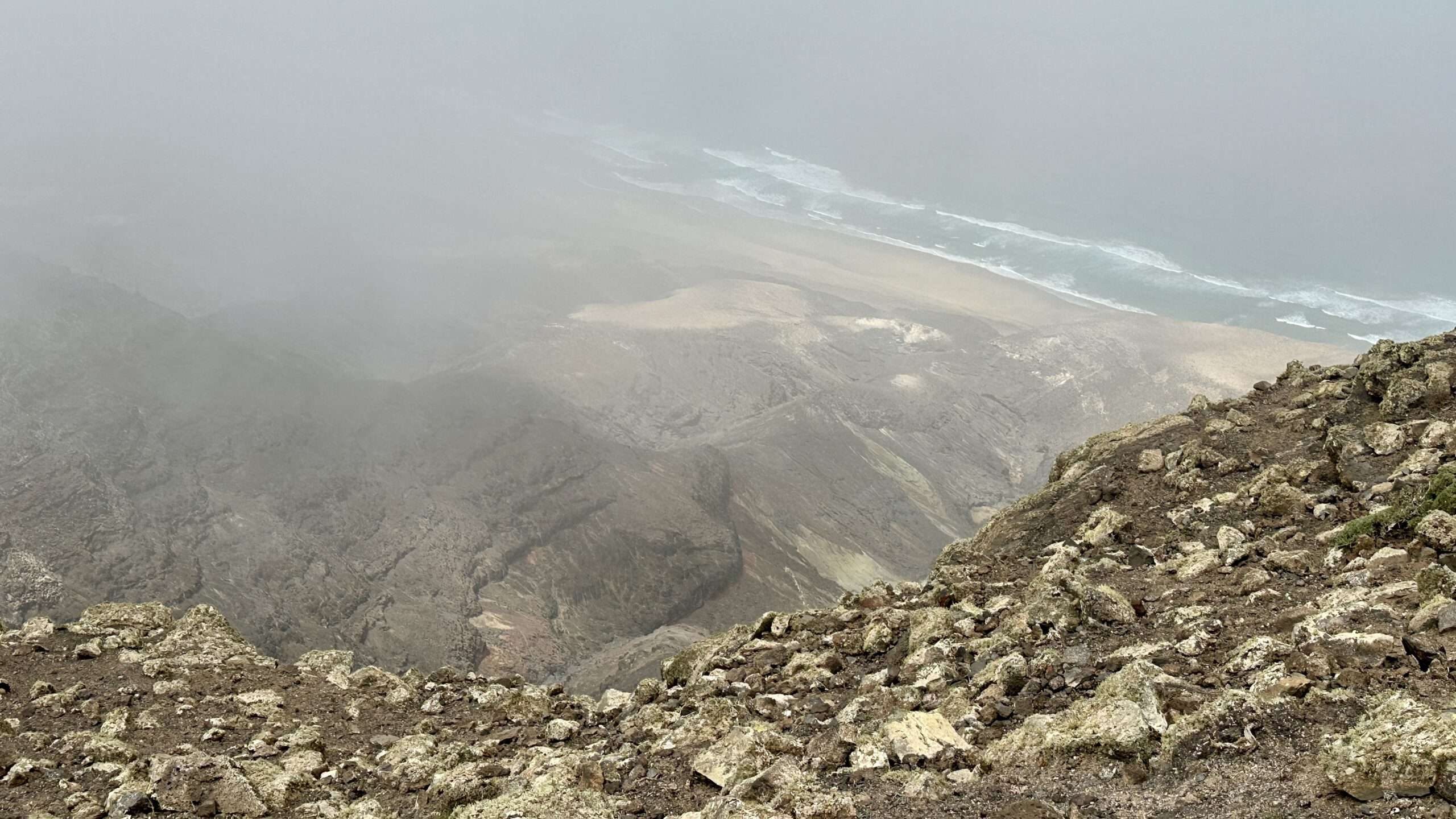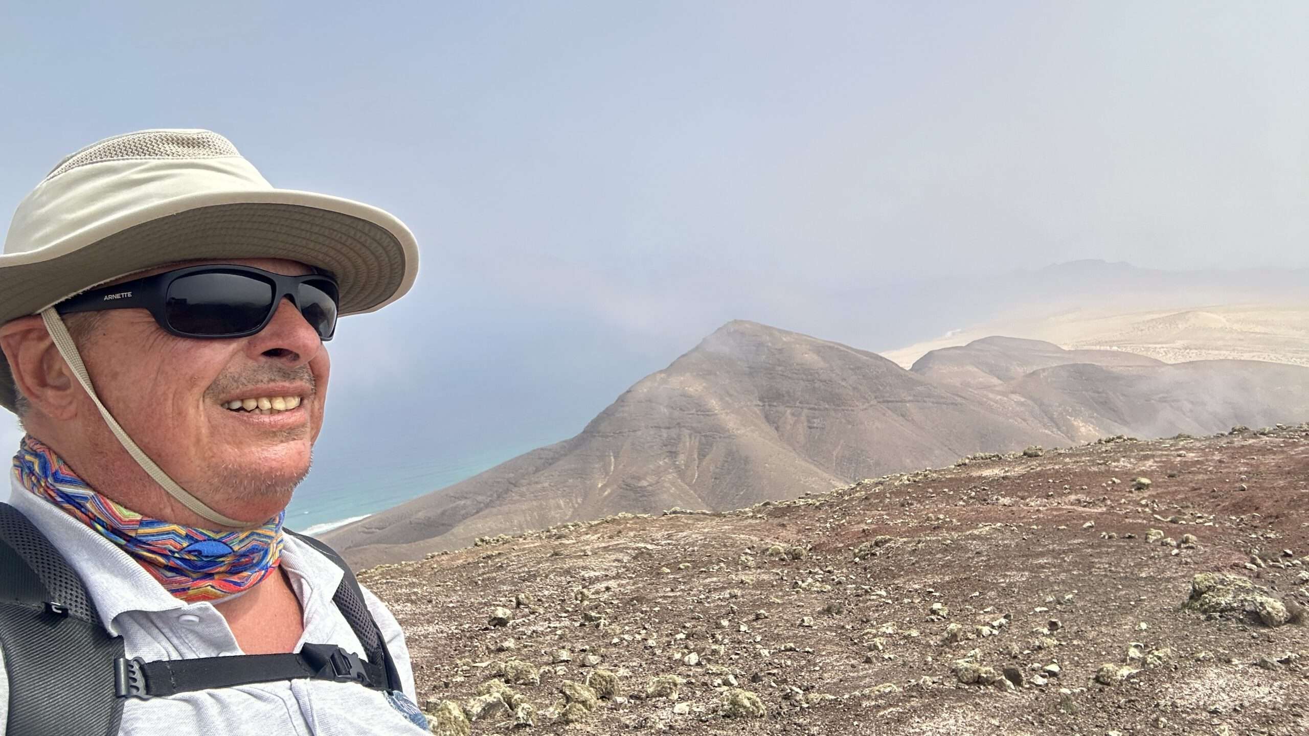 Mit höchster Konzentration, Händen an Fels und Herz im Rhythmus des Atems, stiegen wir hinab und wieder ein Stück hinauf zum Pico del Viento. Von hier führte eine alte Piste zu einer Plattform, wo die verfallene Straße endet und sich der Blick weit öffnet: zur wilden Westküste, zum winzigen El Islote, das wie ein Smaragd im Wasser liegt.