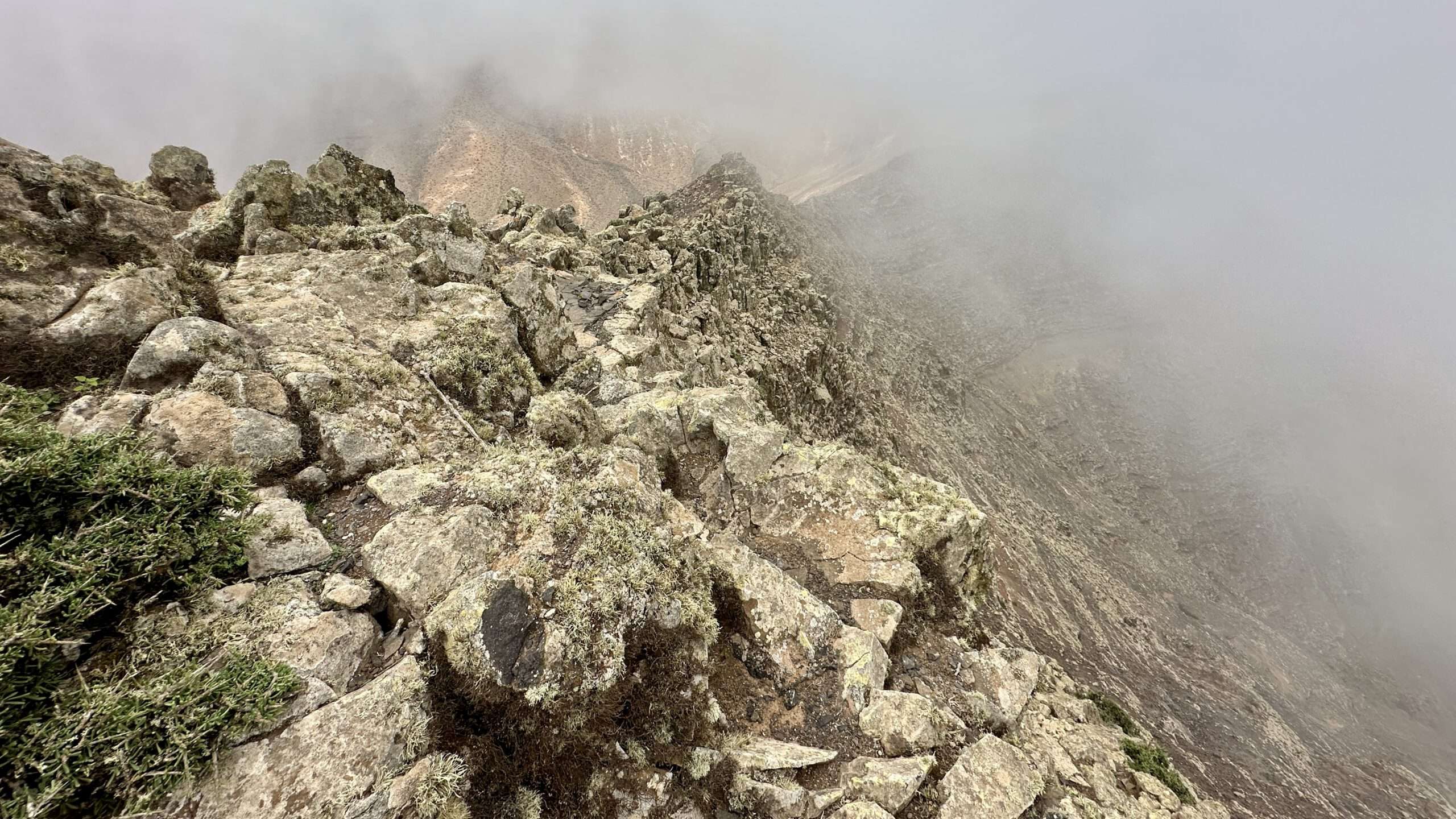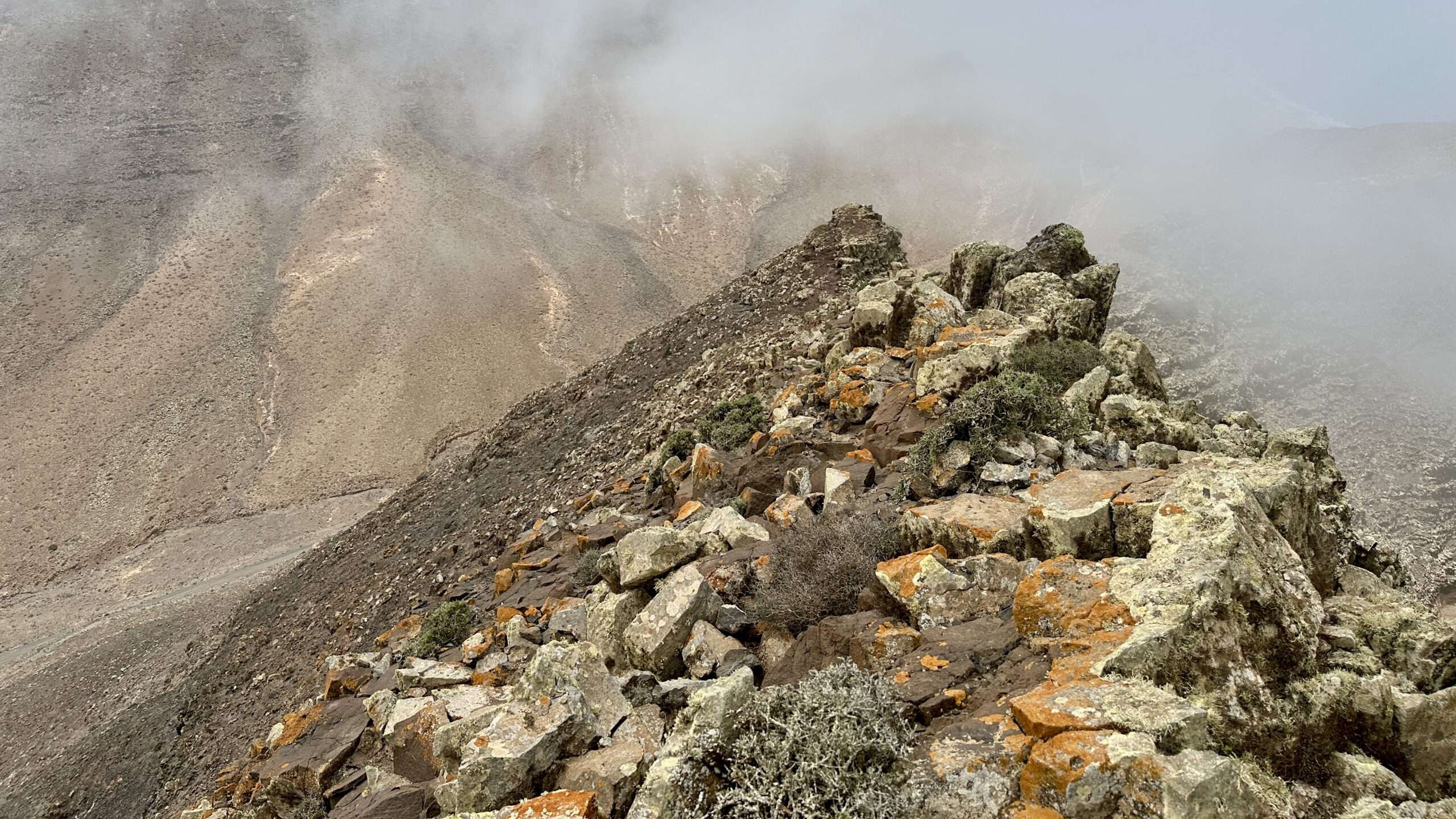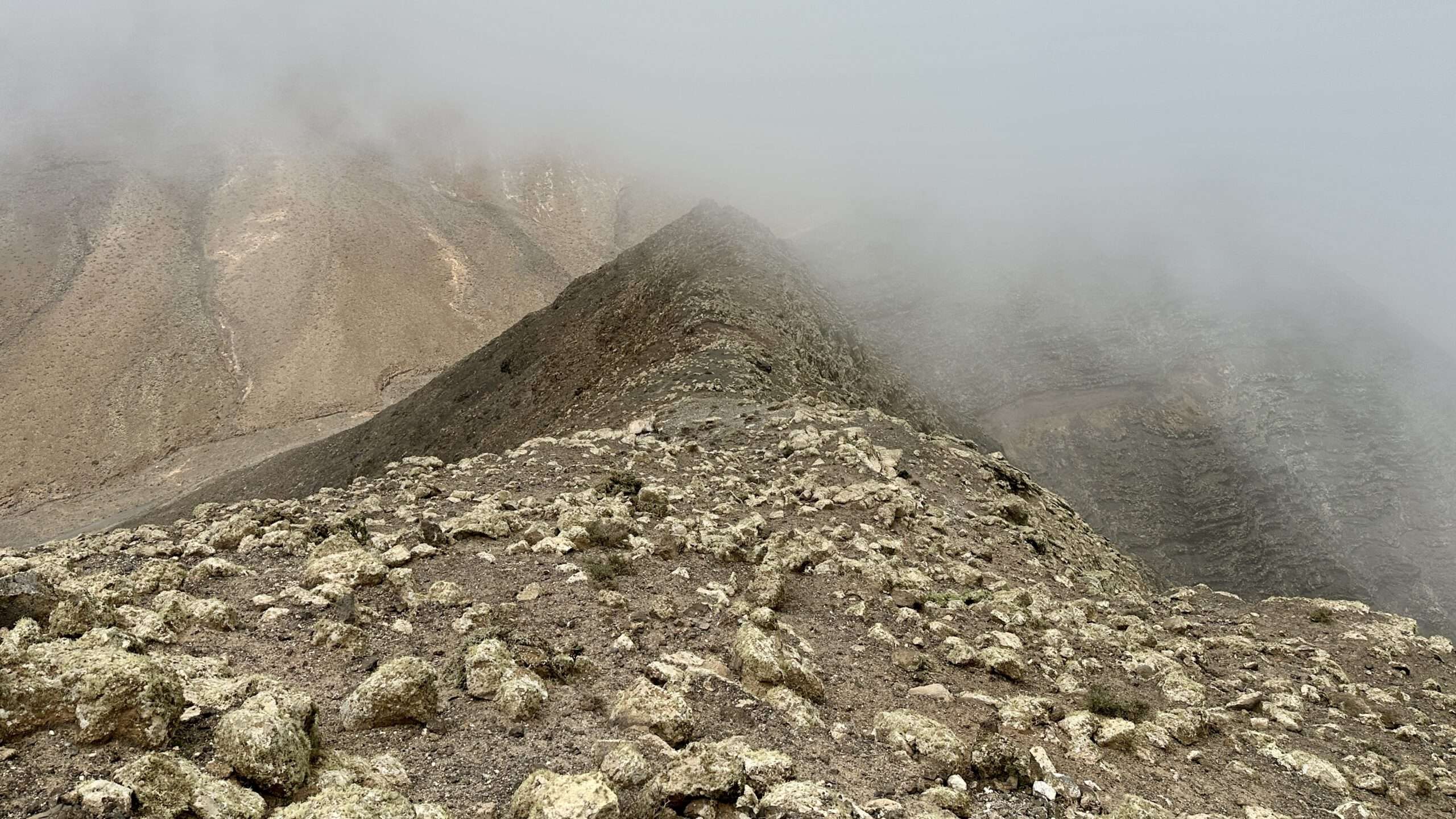 Hinter der Majano Alto und der Cabeza del Valluelo begleitete uns noch ein kleines Geschwader Raben, bis sie uns schließlich in Stille entließen. Die Morro de La Burra auf 529 Metern war unser nächster Halt, doch ein tief hängendes Wolkenband senkte sich wie ein seidiger Vorhang auf unseren Weg. Die Feuchtigkeit legte sich kühl auf Haut und Kleidung, während wir in eine beinahe mystische Stimmung eintauchten.