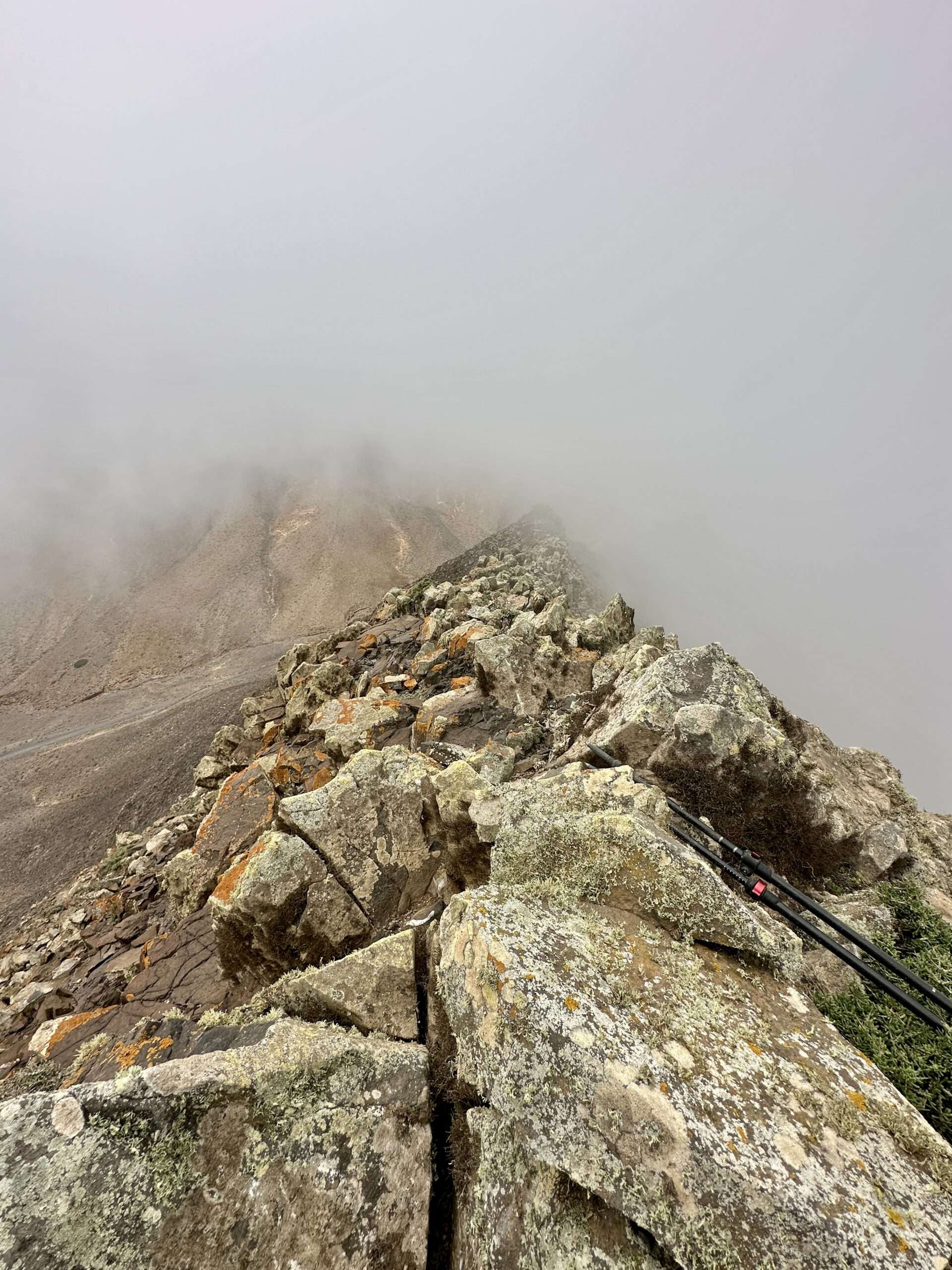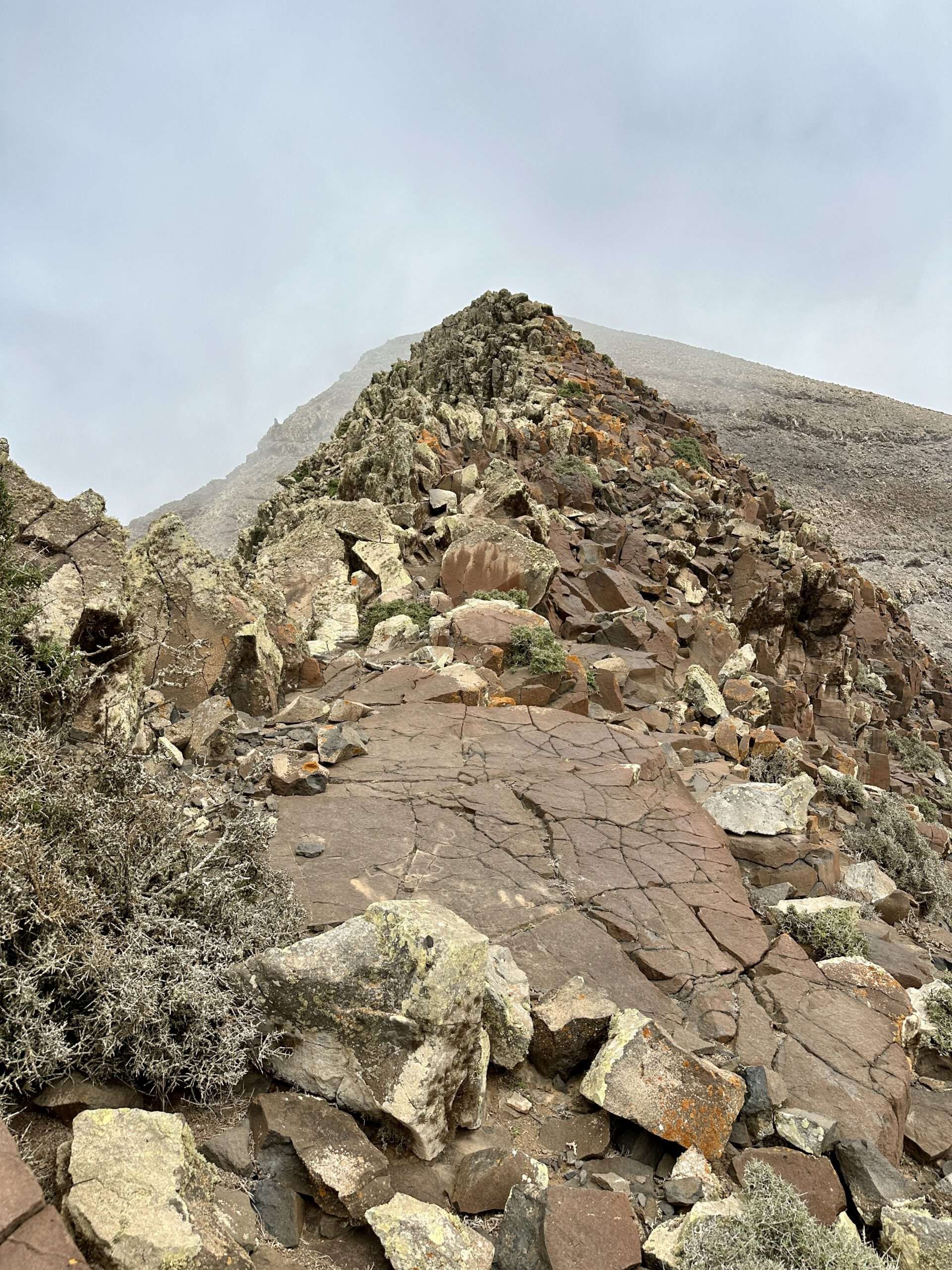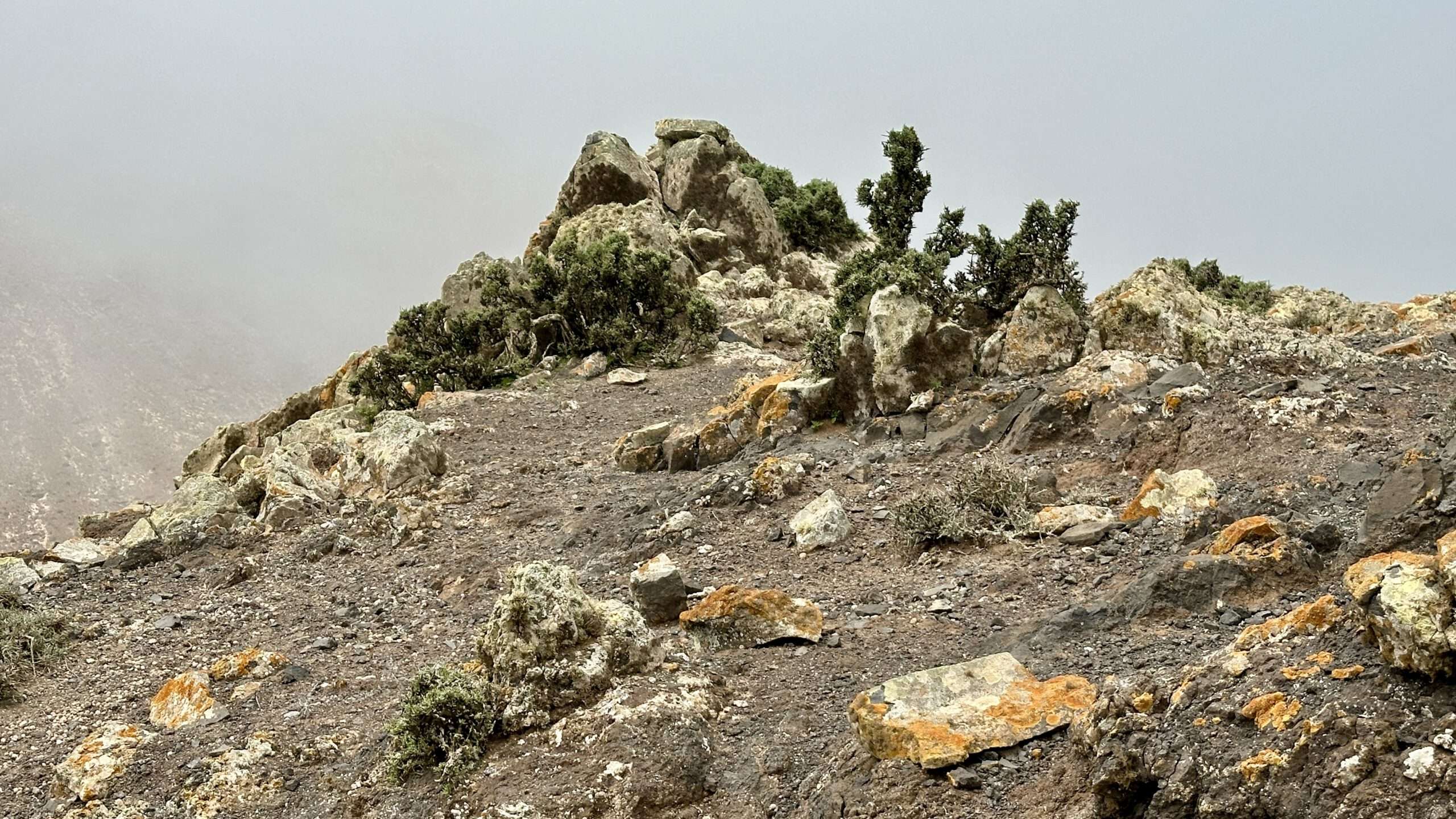 Hinter der Majano Alto und der Cabeza del Valluelo begleitete uns noch ein kleines Geschwader Raben, bis sie uns schließlich in Stille entließen. Die Morro de La Burra auf 529 Metern war unser nächster Halt, doch ein tief hängendes Wolkenband senkte sich wie ein seidiger Vorhang auf unseren Weg. Die Feuchtigkeit legte sich kühl auf Haut und Kleidung, während wir in eine beinahe mystische Stimmung eintauchten.